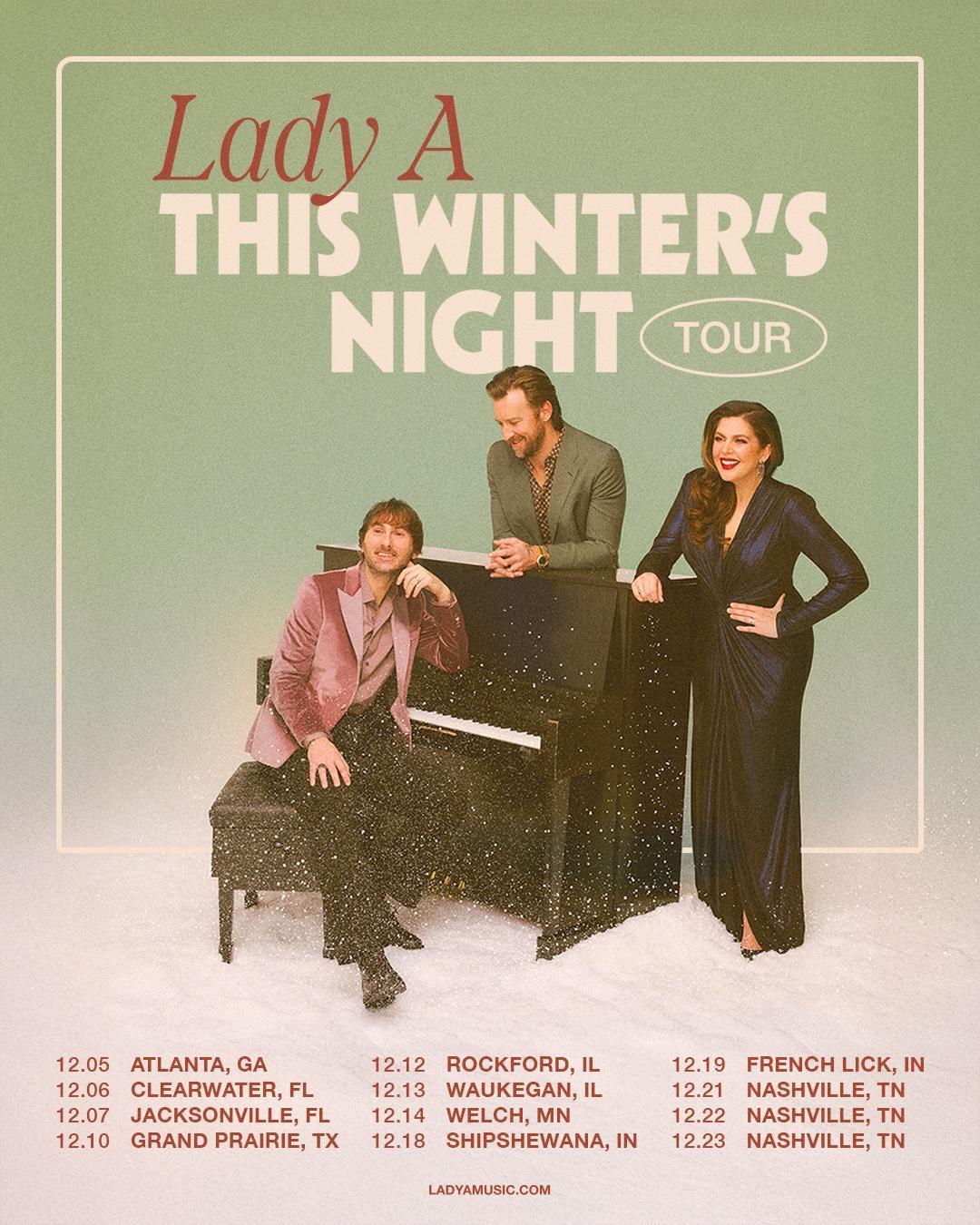 NASHVILLE, TN (July 14, 2025) – Bringing irresistible holiday cheer in the heat of the summer, multi-PLATINUM and GRAMMY Award-winning group Lady A announces their 2025 THIS WINTER’S NIGHT TOUR, spreading 12 days of Christmas music, joy and magic this December. The holiday tour will launch on Dec. 5 in Atlanta, GA at The Woodruff Arts Center’s Atlanta Symphony Hall and will wrap with three consecutive shows at Nashville’s historic Ryman Auditorium. Presale tickets for most dates are available beginning this Wednesday (7/16) at 10 a.m. local time with the code HOLLYJOLLY, and general tickets go on sale this Friday (7/18) at 10 a.m. local time at LadyAMusic.com.