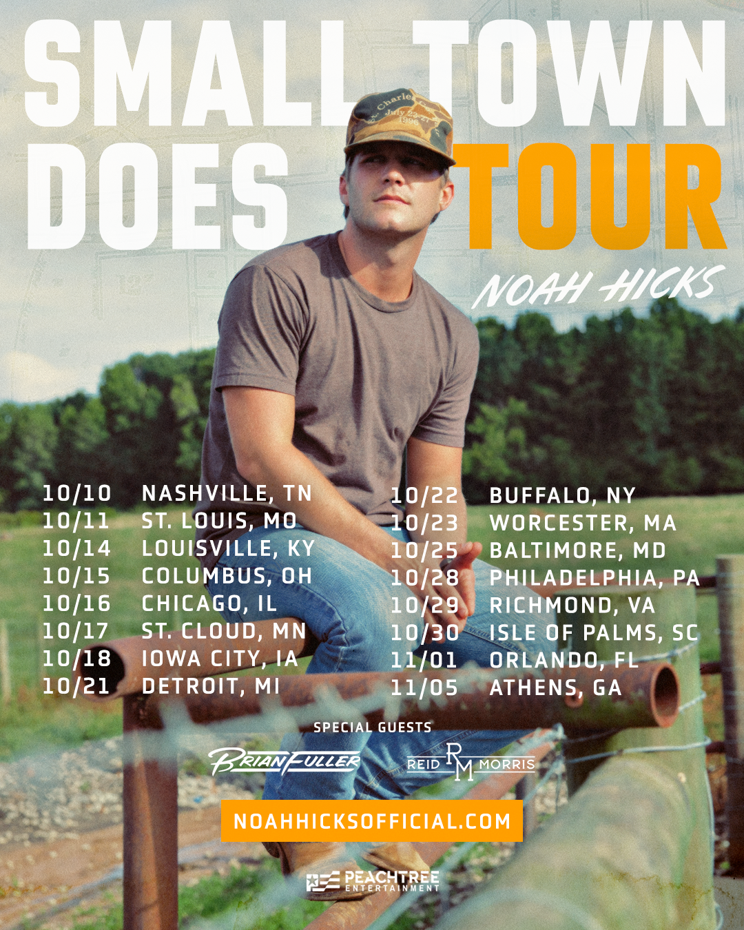NASHVILLE, TN (July 30, 2025) – Today, rising singer/songwriter Noah Hicks announces his headlining Small Town Does Tour. Presented by Peachtree Entertainment, the 16-date trek will kick off in Nashville, TN, on October 10 before continuing to cities including Chicago, Baltimore, Philadelphia and more, and concluding in Athens, GA, on November 5. Pre-sale tickets will be available on Thursday (7/31) at 10 a.m. local time for fans who uncover the special code using this link, and general on-sale will launch on Friday (8/1) at 10 a.m. local time at noahhicksofficial.com. Fellow Georgia-native artists Brian Fuller and Reid Morris will join Hicks as support on the tour.