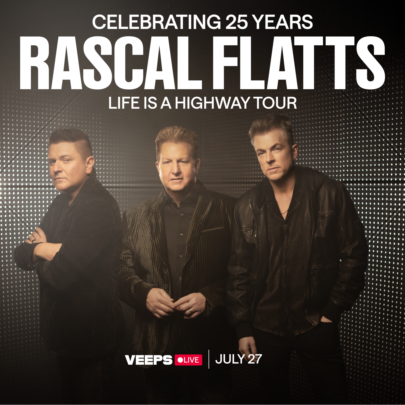 Nashville, TN – July 8, 2025 – Fans across the world can relive Rascal Flatts’ unforgettable hometown show in Columbus, Ohio during a special global streaming event Sunday, July 27th at 7pm CT / 8pm ET. “Rascal Flatts is back and better than ever,” (Us Weekly) with the performance marking the superstar trio’s return to the road for the first time since 2019, and “a testament to their musical legacy, deep connection with fans, and the undeniable magic they create together on stage,” (Country Now). Now, fans will be able to enjoy this unforgettable evening, with tickets available for purchase today HERE. As part of their subscription, Veeps All Access members will be able to watch the show for free. All streaming tickets will include a three-day rewatch window and are available via Veeps.com and through the Veeps app on Roku, Apple TV, iOS, and Android.